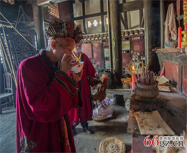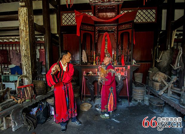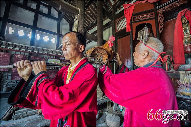 石阡非物质文化遗产傩技上刀山传承人在开坛上做上刀山法祀出门