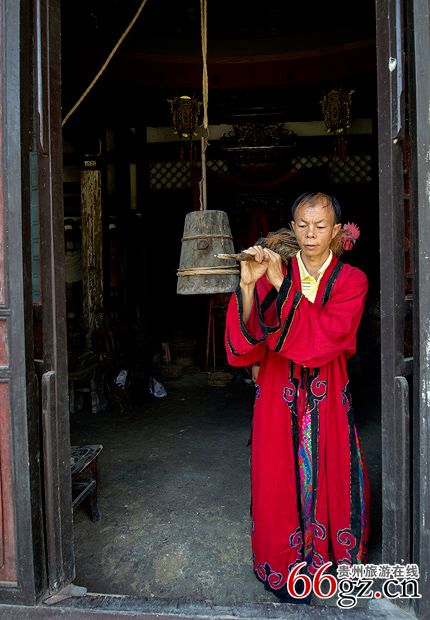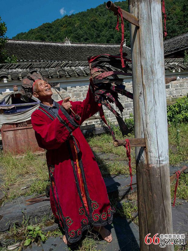 石阡非物质文化遗产傩技上刀山传承人在开坛上做上刀山法祀出门