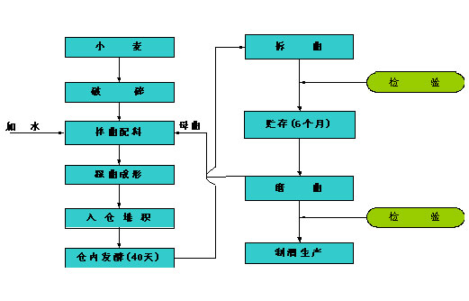 茅台酒曲是传统的酱香型高温大曲,,以小麦为原料。其生产工艺流程如下: