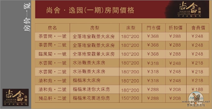 尚舍·逸园一期(茶文化)以茶云间、水云阁、清和苑、临风阁、独品轩五个主题风格八间特色各异的全落地窗大床观景房,甲秀楼、南明河朝暮美景尽在眼底。空中花园,养花饲鱼,观雪听雨,美景相就,悠然茶香,与旧遇新知品茶夜话,尽享和乐融融。共感中式庭院文化的自然静好。是喜欢中国建筑环境美学的个人和小团体在贵阳城中诗意栖居的上佳选择。