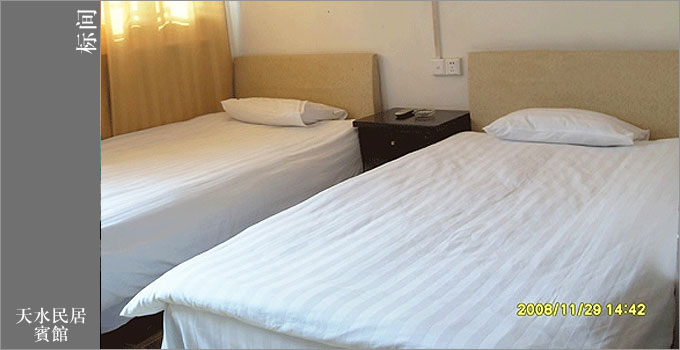 天水民居最大的优点在于干净、清爽、热情,客床都是一人一换,虽然没有高档的硬件设施,可是会让你有种家的感觉。天水民居客房有18间,床位有40多个。其中标间11间,大床房(夫妻间)2间、4间3人间、1间麻将套间(4人房),共有麻将机4台,并配手搓麻将,可加床,是旅游爱好者的首选之地,适合各大院校学生团体、单位和个人,有接待旅行社大型团队的能力,属于经济型客栈。房间的硬件设施全部是新的1.2m的客床,配空调、彩电、饮水机、热水器和独立卫生间,提供24小时热水供客人沐浴。