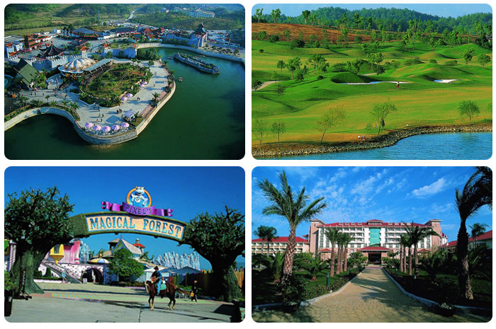 乐满地简介 桂林乐满地度假世界是广西目前最大的外商投资旅游项目,占地面积6000亩,于2000年12月25日正式开幕,其中包括时尚、动感、刺激与欢乐并存的主题乐园、集广西少数民族艺术及乐满地欢乐文化的五星级度假酒店, 依山势高低错落而建的丽庄园森林别墅区、美式丘陵国际标准27洞高尔夫俱乐部。 桂林乐满地度假世界位于广西桂林市兴安县,距桂林市仅63KM,全程由6车道国家一级公路相连。从桂林市区到乐满地的车程仅为45分钟,从桂林两江国际机场到乐满地的车程时间约为55分钟,沿途还可欣赏到桂北特有的田园森林景观及喀斯特型地貌。在2007年度被国家旅游局评为“AAAAA”景区,同时通过了ISO9001及ISO14001两项国际权威机构的质量标准体系认证,被评为“2002年度中国旅游报.中国旅游知名品牌”以及“全国十佳主题乐园”;2005年主题乐园获得“广西十佳旅游景区”的称号。