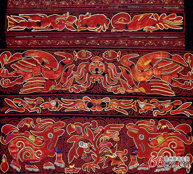 因此,尽管台江苗族服饰种类繁多,装饰图案不胜枚举,但不论是长裙系、中裙系还是短裙系,蝴蝶、水牛和锦鸡图案和造型是必不可少的。“蝴蝶”是苗族血缘始祖的符号,“水牛”是苗族人文初祖的图腾,“锦鸡”是操黔东方言苗族这一部落和这一部落各氏族的“徽章”。在苗族观念里,鱼是繁殖能力最强的生物,是苗族心目中的“生殖神”,用鱼作为服饰图案,寄托的是苗族企盼子孙繁衍、人丁兴旺点美好愿望,同时,鱼也是苗族祖先最先享用的食物,用鱼作为服饰图案,还表达了苗族不忘祖先、不忘故土的情结。