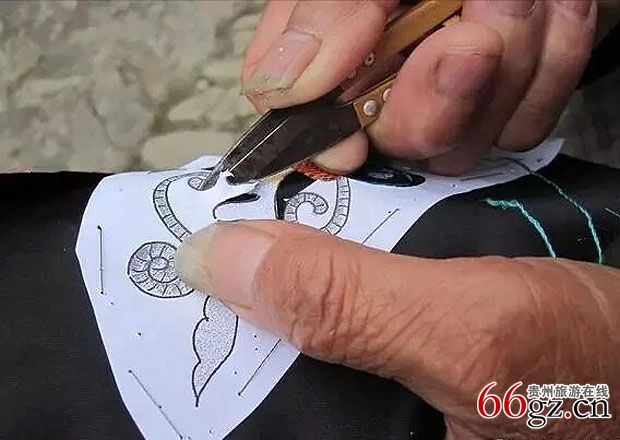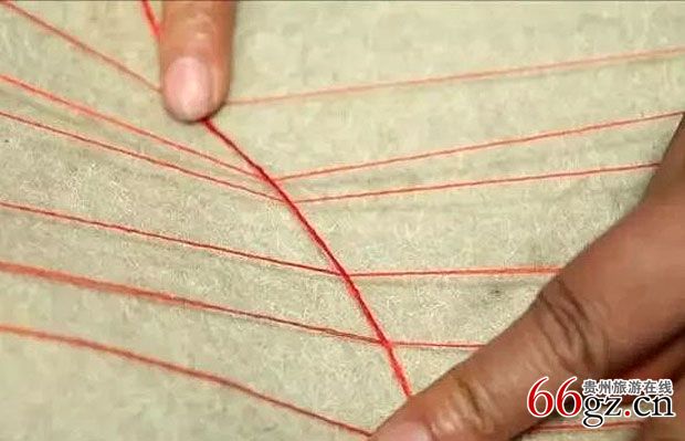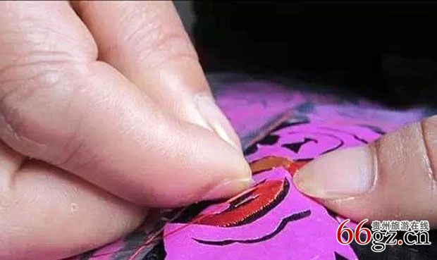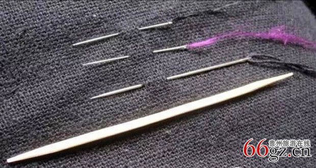 破线绣须用线穿上针,并随针穿过皂角液上浆 ,线变得平滑柔挺、光泽紧密 再用平针针法刺绣。