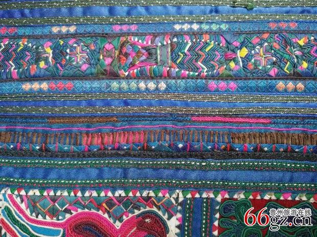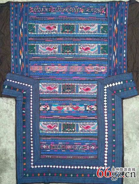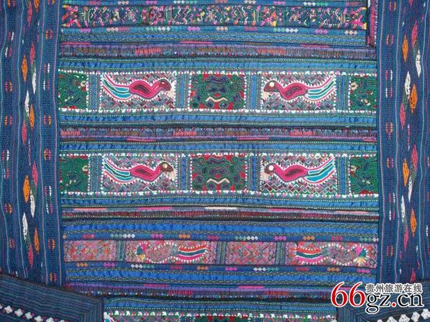 这是台江革一的苗族堆绣背带是的鸟鱼图案(中间的鸟图案用的是双针绣绣法。)