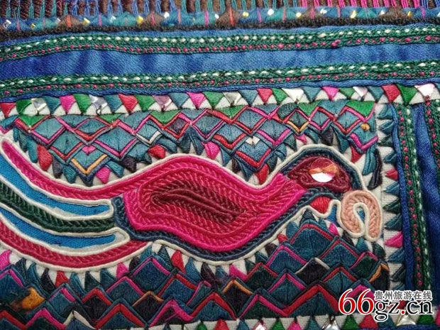 这是台江革一的苗族堆绣背带的局部鸟图案(鸟图案用的是双针绣绣法,鸟图案四周以堆绣围绕。)