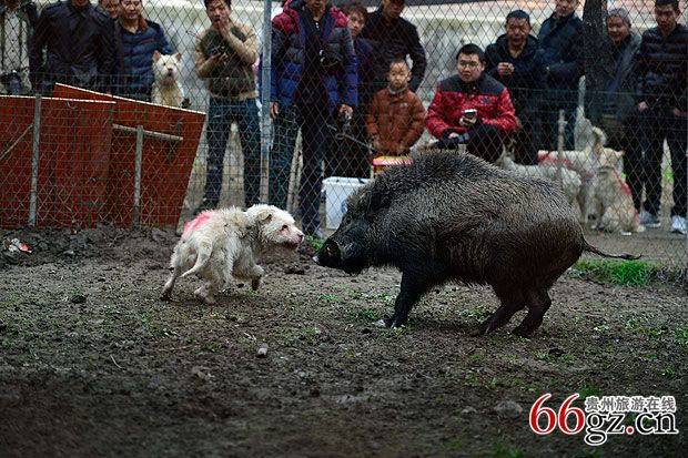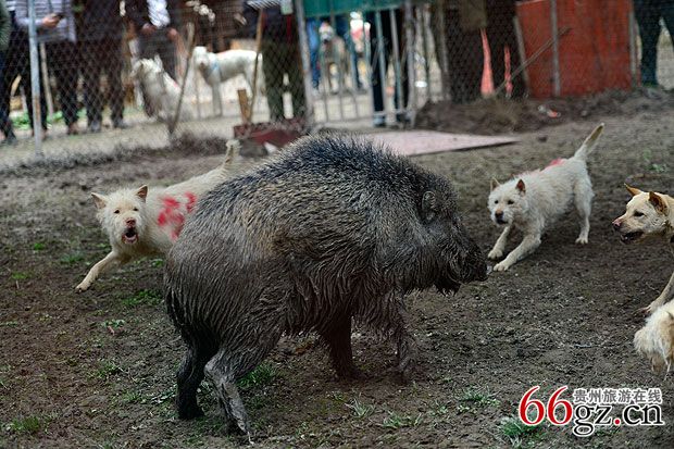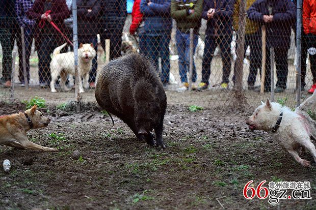 只见身上标着编号的斗犬被逐一放逐进赛场,与凶猛的野猪对决。有的是单只斗犬与野猪展开周旋,蓄势进攻;有的两只斗犬相互配合,左右夹击,演绎着动物界斗智斗勇的游戏。