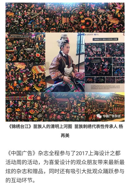 《中国广告》杂志在2017上海设计之都活动周专门对《锦绣台江》苗绣长卷的刺绣代表性传承人杨再美进行了报到和专访
