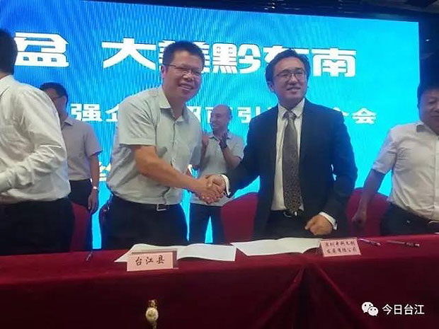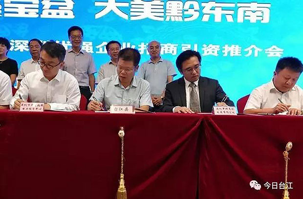 8月31日上午,在黔东南州赴深圳面向优强企业招商引资推介会上,中共台江县委副书记、县长杜贤伟与深圳中科文创发展有限公司负责人就台江全域旅游综合开发项目达成合作意向,并现场进行签约,投资额1亿元。