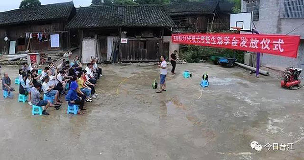 9月2日,台江县革一镇西南苗寨全村男女老少聚集在该村篮球场,以发放“助学金”的方式祝贺两名即将踏入大学校门的贫困家庭学生。
