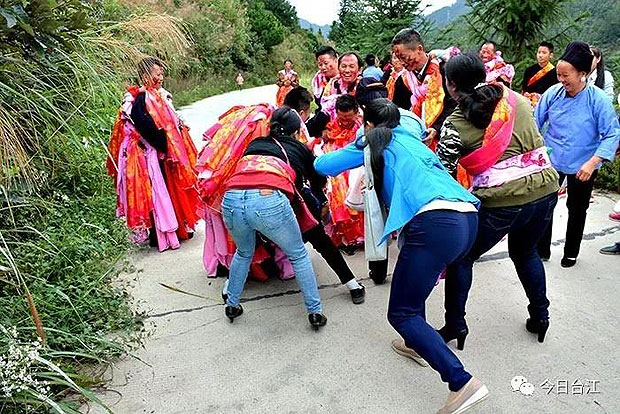 挑喜水,新娘来到新郎家,作毕仪礼后,由新郎的妹妹带新娘到寨边最远的水井去挑“喜水”。新郎家的房族姑娘和送亲女伴一同前往。来到水井边,拿瓢舀水的是新郎的妹妹。一般五瓢为准。意为:一瓢舀吉祥;二瓢舀富贵;三瓢舀子孙;四瓢舀平安;五瓢舀家当。