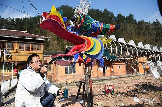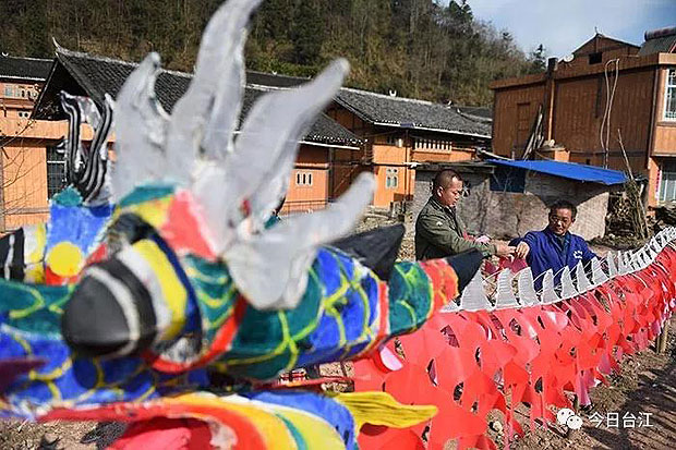 1月17日,在台江县温泉村打革屯下屯,村民在扎制硬浆彩龙。