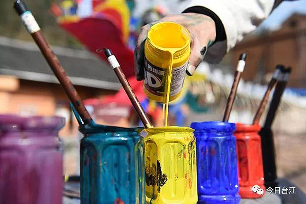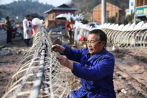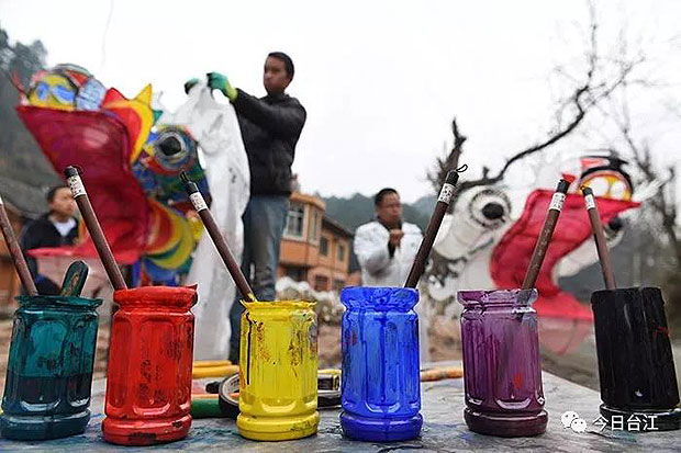 当日,台江县温泉村打革屯下屯村民,在加紧制作两条长度为32米,重约300斤的硬浆彩龙,为春节期间、元宵节舞龙嘘花节做准备。