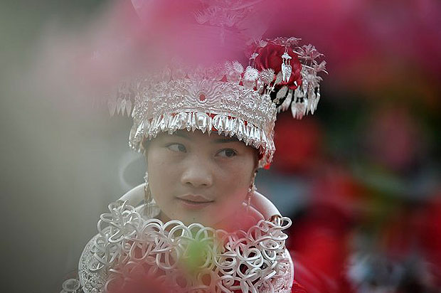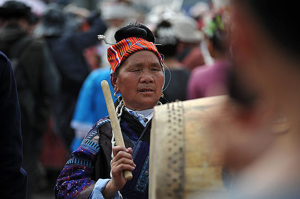 挑着所需用品,从周边村寨赶来施洞过姊妹节的妇人 摄影:喻勇