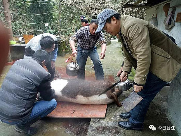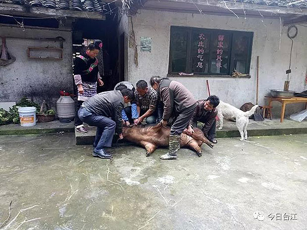 连日来,随着春节日渐临近,外出务工人员的陆续归来,台江县农村家家纷纷杀年猪备腊肉迎春节,到处呈现一片浓浓的喜庆氛围,杀年猪吃炰汤是该县乡村一个传统风俗。