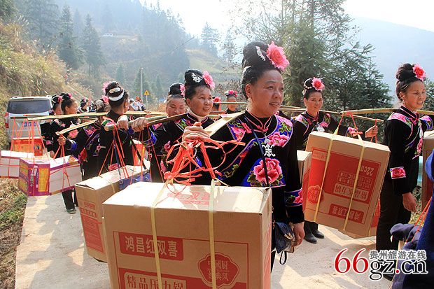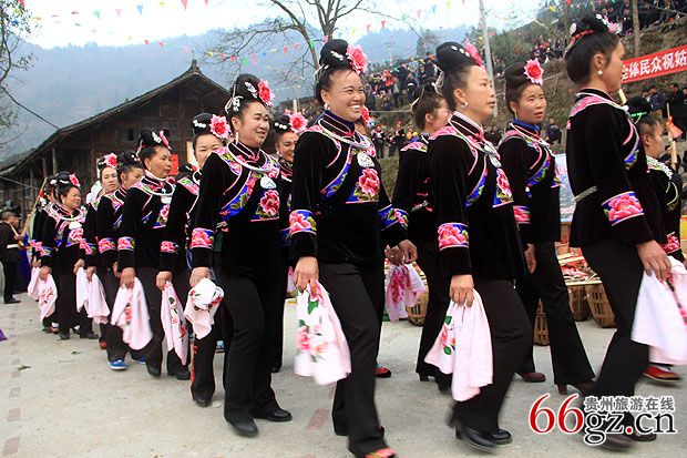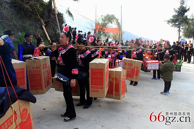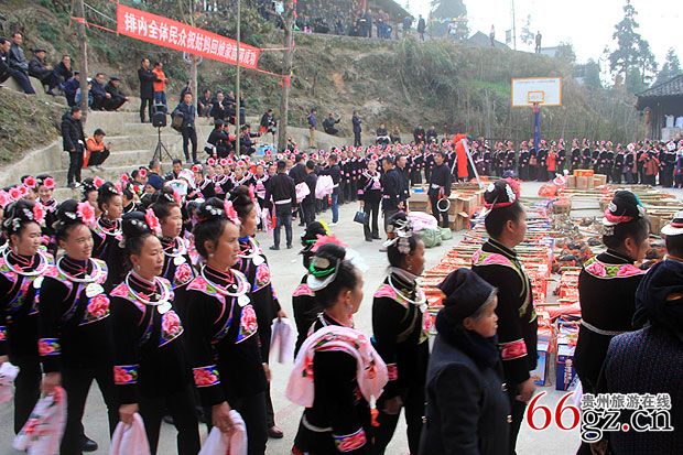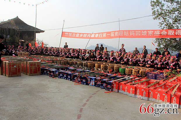 在村口,一幅“笙歌喜迎姑妈回家拜年,姊妹相约故里共度佳节。”的行书对联竖立在用竹子临时搭起的简易竹门的两边,使简易的竹门有了几分喜庆。中午12点30分,延绵公里的姑妈队伍正式踏入寨门,排内苗寨历史以来的第一次姑妈回娘家拜年的活动正式拉开序幕。