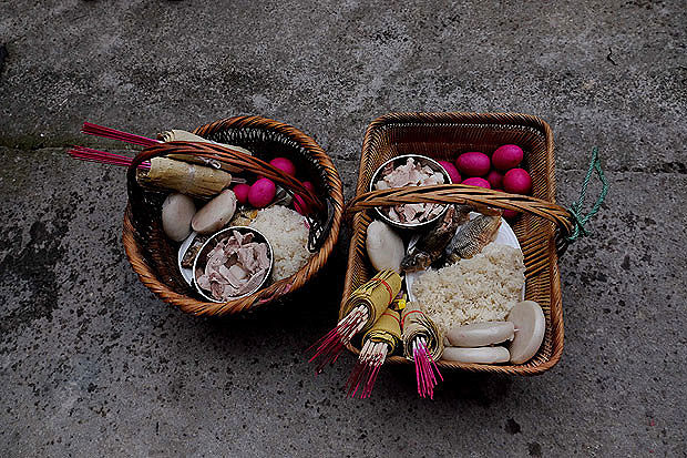 在敬祭时,祭品用糍粑三个、鱼三尾、糯米饭一团、鸭蛋一个及酒水;其中鸭蛋是不可少的。蛋是小孩最喜欢的东西,用蛋作祭品可以将“阴孩”逗引到自己家中来(祈盼人丁兴旺)。
