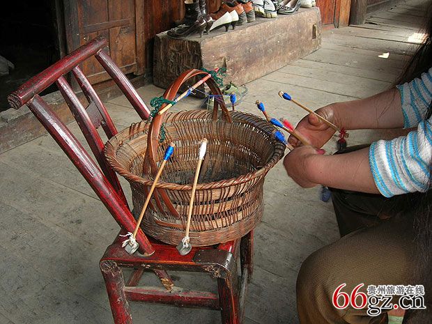在和老人家交谈的时候,老人的儿媳在美人靠前下编织花带,一个竹篮,几根竹棍,各色的棉线在她的手中就可以编出美丽的花带,这是当地妇女都会的手工,这是她们给自己的女儿准备嫁妆不可缺少的技艺。
