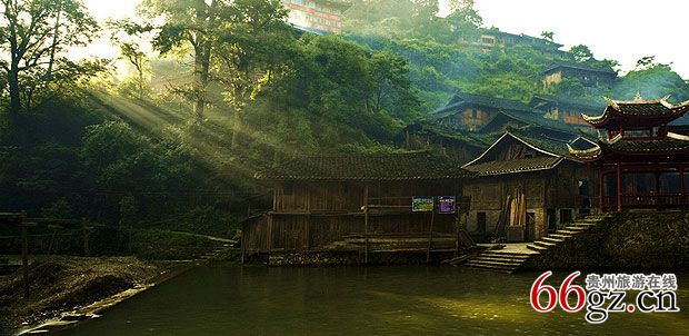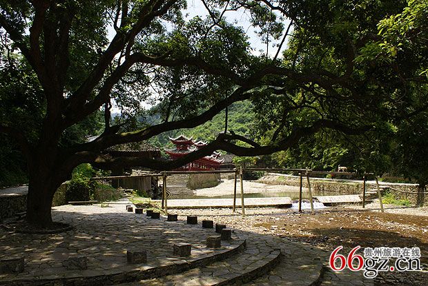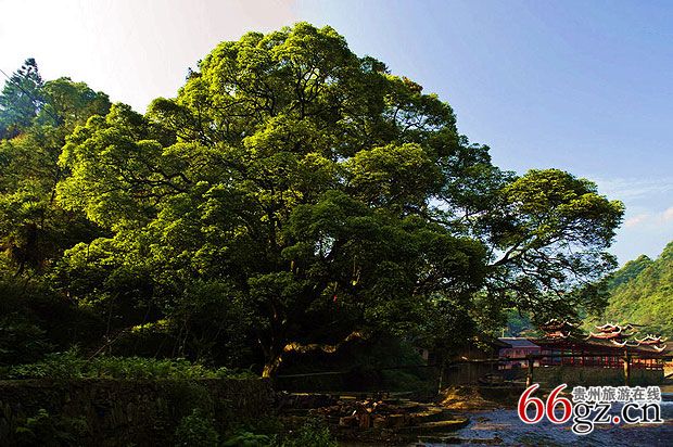 红寨坐落在山谷间,寨子里的木楼依山而建,错落有致。繁茂的植被、好几条顺着山势流淌的溪流穿过寨子。清澈的溪流,不深却日夜歌唱环着寨子歌唱。大约因为溪流的原因,寨子里有很多大大小小的桥,进寨子的的五孔桥高高耸立的比较宽阔多条溪流汇聚的溪面上,旁边一株茂盛的大树,安安静静的和木桥守着寨子的必经之路上。苗寨里怎么能够少了风雨桥呢?过了红寨的风雨桥,就是芦笙场,通向寨子各家各户的数条小路从这里开始蔓延。