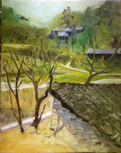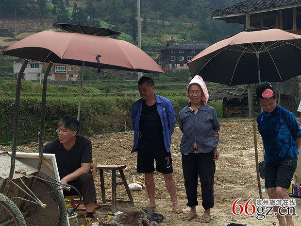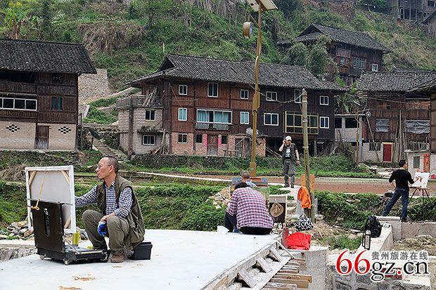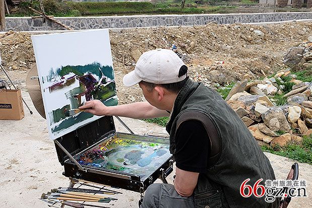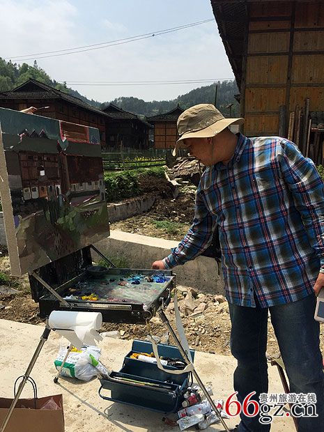 4月9日的写生地点是九摆苗寨。九摆苗寨是一个较大的苗族自然村寨自然环境比登鲁苗寨好得多,土地平旷,一条小溪从红阳山麓静静流来,在苗寨寨脚弯曲着汩汩流淌,有了这长流不断的小溪,给这不算太大的田园坝子注入了无线生机,富足了这一方水土,养育了这一方百姓。 4月9日这天,天气晴朗,气温达到28度,很炎热,画家们来到九摆苗寨时已近中午,太阳火辣辣的烤得人睁不开眼,为了争取时间,画家们顾不上休息,在火辣辣的阳光下支起画架,一画就是几个小时,汗水湿透了干,干了又湿,画家们全然不顾,专心作画。时逾5时,画家们才收拾好画箱和画作,踏着晚霞赴归程。