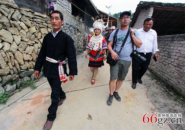 桃树榜组长张权(左)带领我们参观全寨 摄影:龙胜海