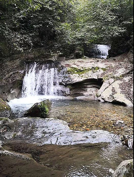 再次下到溪边走,看到的是两重瀑布,第一道瀑布冲刷 下来,在青石平台上休息了一会儿又形成另一股瀑布。值得