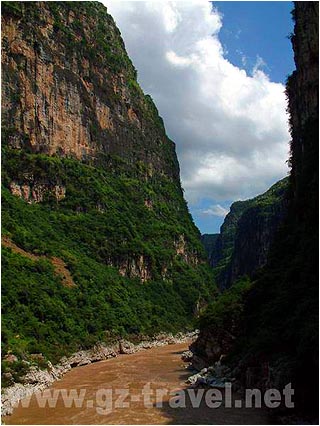 2、 轿子岭观峡:此景点在北盘江上,但沿古驿道到江边大约要花40分钟,此景点到江边落差580米,呈85度坡。站在此处观峡谷,谷底全貌尽收眼底,可体会到地球的裂缝的真谛。