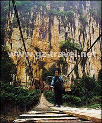4、 花江铁索桥:花江铁索桥始建于明代,桥宽3米,桥长72米,高70余米。她像一道倒挂的长虹,横卧在北盘江两岸的悬崖峭壁之间,上托青天一带,下吻浪花万朵,堪称花江大峡谷的一个奇观。我国著名地理学家徐侠客在《黔游记》中这样描述:桥以铁索,东西属两岸上为经,以木板横之为纬。东西两岸相距15丈而高且30丈,水奔腾于下,其深不可测……,是游人灵幽揽胜之地,游客到此若能做过桥去回来,在心目中不由自主的会自豪地感到自己做了人生中一件最勇敢的事,尽情的享受穿山越岭飞越天涧的乐趣。