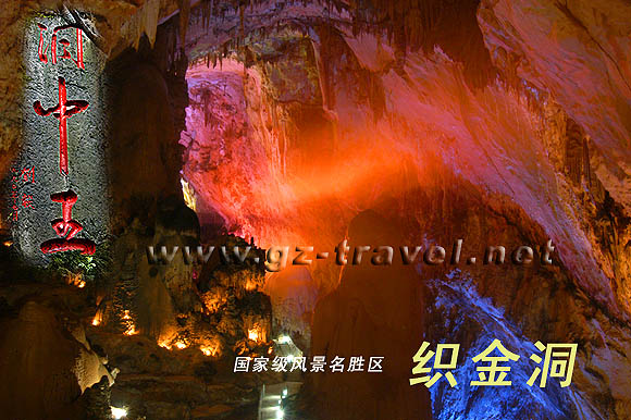 织金洞又名打鸡洞,位于织金县境内。它由11个景区,47个厅堂,150多个景点组成一个天然洞穴美景。洞口是花园式的迎宾厅,千奇百异的花草点缀着"双狮"、"玉蟾"、"飞来石"等石景,迎接着来自远方的客人;正午时分,烈日当空,万道金光从洞顶洒向织金洞,在水蒸气的缭绕弥漫中彩环重现,阳光下的小水滴恰如一串串晶莹而透明的珍珠散落人间,其境美不胜收,其意可幻可切。琳琅满目的钟乳石,大的数十丈,小的如手掌,织金洞的银雨树,是一种罕见的花状透明结晶体,从白玉似的托盘中冲天而起达17米,亭亭玉立、珠光宝气;水晶宫又名雪香宫,宫内的钟乳石表面皑皑石雪,顶头冰柱高挂,地上石笋密布,幌如东海龙宫。
