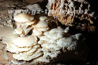 织金洞的看家宝算是卷曲石,它透明晶亮,易折、易损、易碎,它能回避地心引力,自如地向空中曲卷而生;金塔宫是一个巨大的塔林世界,它的面积可达1.6万平方米,耸立着100余座金银塔,其间有石柱、石幔、石帷、石藤、石笋等。夏季气温上升时会有霸王盔神女与蛇、石竹园螺旋树、雪松、神秘大佛、灵芝山等景观。