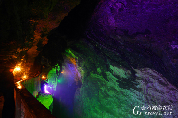 三洞天“金光天”洞内高大宽阔,迂回幽静,左岸石壁异常光滑,如刀砍斧削,右岸壁上悬挂着五颜六色的钟乳石;