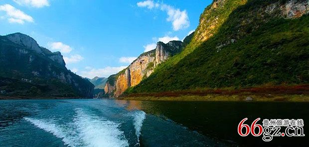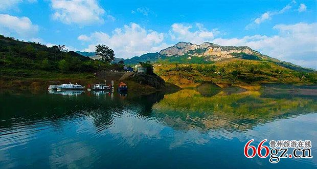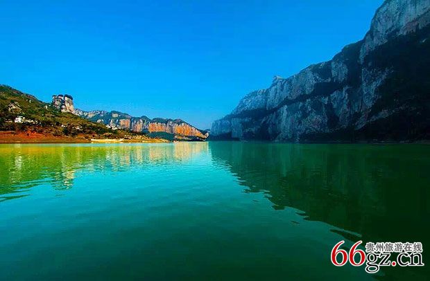 景区湖水清澄,倒影沉碧,宁静秀丽,两岸峰壁险峻,气势恢弘,且多瀑布山泉跌落湖中,有“山似三峡而水胜三峡,水似漓江而山胜漓江”的美誉,是千里乌江上最美的崖壁画廊,因此称乌江源百里画廊。