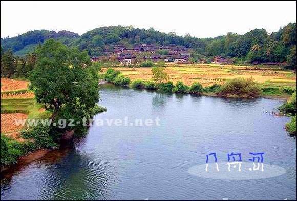 八舟河风景名胜区是省级重点风景名胜区,集中了我省南部侗族地区自然景观,民族风情等旅游资源的精华,别具特色. 八舟河主景区以高屯镇为中心,高屯一面依山,两面傍水,悬崖峭壁,秀丽险要,古为屯兵之所.春夏青山碧水,秋冬红叶映霞,景色绮丽,如诗如画. 八舟河风景名胜由石灰岩喀斯特地貌景观,江,河,溪,库,湖 岛水域景观,亚热带喀斯特森林景观,地下溶洞景观,丘陵草场景观以及村寨田园光和侗苗风情所组成.风景区分别沿八舟河.福禄江自西南向东北延伸.面积15平方公里,平均海拔400米.拥有众多的奇峰,悬谷,溶洞,天生桥等奇异景观.蜿蜒的八舟河象一条蓝色的飘带浮游在冈峦起伏的丘陵,草场,丛林之间,连接一串串如翡翠,玛瑙般色彩斑斓的景点,构成一幅幅既粗犷瑰丽又清新淡雅的山水画卷. 八舟河的源头,是雄峙于群山环抱中的八舟电站大坝,断高山云雨,出高峡平湖,每当雨季,湖水漫坝垂落,犹如在两山之间横空而挂的一幅银色巨幕,飞泻而下的瀑布,响声震山谷,极为壮观.顺河而下,眼前呈现的是一派田园风光的八舟村.村边和岸上原由沙洲八个,如八小舟浮于河面,故八州村是为名.八舟河岸有一岩,名仙人岩,高数十丈,悬崖峭壁,有零星小木点缀其间,在异峰突起的峭壁顶端,并立怪石四尊,如仙人奕棋,山巅正中,有一劲松敖立,形如巨伞,遮盖四仙,岩下八舟河蜿蜒东流,河雾升腾,云蒸霞蔚,山峦浮云,俨然"蓬莱仙景",为黎平一大名胜. 八舟河下游还有一景,名"江心岛".距鸬鹚架大约500米,四面环水,远远平视,江心岛若浮水面,岛上古木交柯,翠竹列岸,鸟啼蝉鸣,风光绮丽.由此乘舟逆流返程而上,经上乌鸦左拐入福禄江,上行1.5公里至湾寨桥上游.这里两山夹峙,山环水绕,河谷紧锁,一天然石拱桥横跨两岸峭壁之间,此桥由古河伏流穿凿而成,桥身为石灰岩,自然精巧.桥壁上有许多石乳堆积形态,如:唐僧取经,青龙腾飞等,形态各异,栩栩如生.桥下为一深潭,河水穿桥而过,周围森林覆盖,野芳侵道,富有幽僻之野娶,桥前后两端岩壁下有穿洞,溶洞,游人可从桥下穿洞盘旋而至桥上,天生桥宽118米,拱跨103.1米厚40 米,距离=水面33,64米.远远望去,巍然矗立,奇崛壮观,.堪称天下第一桥.有诗曰:人凿难施鬼斧穷,天心穿出地玲珑.两山壁立龟梁架,巧夺争传造化功.近年来,来此游玩的人络绎不绝。