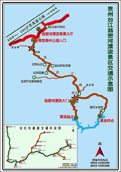 贴士: 交通:贵阳—凯里—台江(全程高速,约240公里)—翁密河(从县城至翁密河39公里,其间经过黔东南州著名的民族旅游风情村寨——红阳) 票价:150元/人(团队可优惠:在线订购;咨询电话:0851—6576126),漂流时长约2小时。