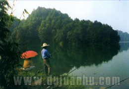 杜鹃湖全长7.4公里,湖面88万平方米,水深1 5一40米,库容1339万立方米,呈树枝状展布,港汉幽深,四周层峦叠翠,植被良好,杜鹃、杨梅、映山红林是景区的主要特色。每当春暧季节,沿湖两岸杜鹃盛开,遍地姹紫嫣红,杨梅叶绿繁茂,掩映着红果垒垒,清香四益,映山红怒放,与毛栗树,杂树交相斗艳,苍松蔽日,红绿相间,泛舟湖中观赏杜鹃、杨梅、情趣盎然。秋天则枫林似火!与湖水相映,如红霞满天,海中蓬莱。有“霜叶红于二月花"的逸趣。