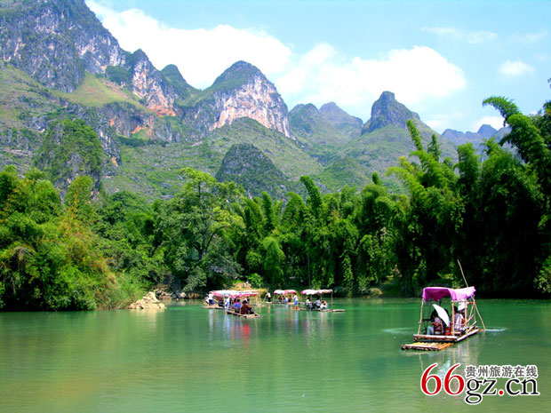 大小井碧绿的溪水和在竹筏上嬉戏的游人