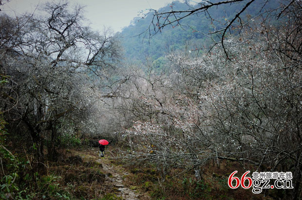 保护区内,自然生长着2万多亩梅林,是我国最大的野生梅基地,每年元月初到2月底,当暮冬时节、万木萧疏的时候,这里却是满山遍野、争相 万亩梅原辉映的梅花,千树万树野梅凌寒弄影,使原始森林里暗香疏影,含春闺中,把绿色的喀斯特原始森林装点成“南国雪原”真可谓飞雪入林枝上白,飘花沁鼻暗香风。