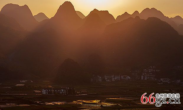 万峰林的山与河与村完美的组合,对摄友来说无疑是天堂。登高远望,青灰色的秀峰似林,黄绿相间的田野成片,村庄坐落其中,小河弯曲延伸,一幅瑰丽绝美的山水画卷呈现眼前。