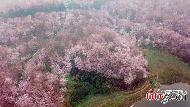 17日在暮色未褪的平坝清晨,空气中还漂浮着一层水雾,但按耐已久的万亩樱花,已忍不住全面绽放,宛如仙境。