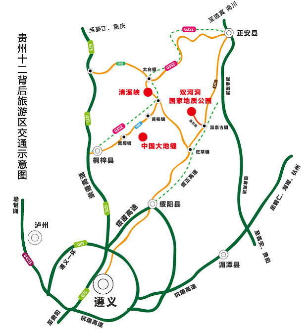 a、遵义(绥遵高速约31KM) →绥阳(207省道56KM)→温泉镇→双河洞