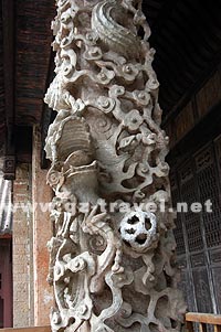 第三大院,是由正殿(大成殿)、两庑和大成门合围而成的一座四合院。大成殿是面阔二十米、长五间歇山顶式石木结构大殿,建在两米高的石基上。过去殿内供奉孔子、“四配”、“十二哲”牌位。大成殿前廊为一列透雕花落地门窗。殿前明间檐下有两根檐柱,是用两块巨石透雕镂成的盘龙大柱,柱础为石雕狮子,柱高近五米,直径约八十厘米,工艺精湛绝伦。两条石龙宛如从天而降,龙身时隐时现,龙首遥相呼应,栩栩如生。柱础石狮为雌雄二狮,雄狮足蹬绣球,雌狮怀哺幼狮,口含铜铃。二狮背负万钧,昂首奋吼,形象骁猛异常。它们与大成门外的另两根石龙柱,同被称为“文庙四大石雕瑰宝”。