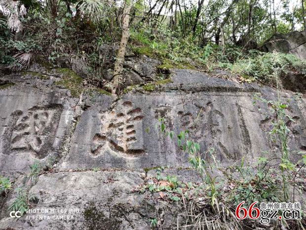 大字后面竖刻七行行书小字,字径大小不等,见方约0.1X0.1米,刻文为: