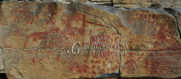 岩画在石壁低部内凹,可避雨,并有四处洞穴,依次下降,位置较高者为一出水洞,四季有水,其它洞穴开口小,内部较宽、干燥,洞口处对应石壁项部有明显烟熏遗迹,似人为造成。