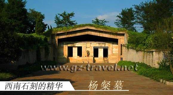 | 杨粲墓,坐落在贵州省遵义县龙坪永安皇坟嘴,距遵义市区10公里。建于南宋理宗淳祐年间。为平顶双室,用白砂岩条石砌筑,最大的一块石料达一万二千余斤,以子母扣层层套合的方法固定。占地面积50.1平方米,在西南地区已发掘的同类墓中居于首位。