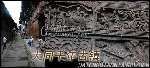大同场原名“大洞场”,命名、设场始于清代,因附近多激流飞瀑且古汉语称激流为“洞”而得名;因位于川黔接壤区域、商贸活跃而设场市。大同场前的大同河水域可通机动船只,后有可出黔入川的赤叙公路,东西有牛鼻山、洞坝山为屏。场内规模较大的建筑主要是建于清代的天后宫、禹王宫、万寿宫、王爷庙等庙宇;列入省级重点保护文物的名胜古迹有“清代议大夫陈贡珊碑”等。大同场的历史,众说纷纭,莫衷一是。一说有千年之久,依据是距大同场不远有马鞍山汉代古岩墓群,而大同场适宜先民聚居、生产和生活,推断形成于公元25年(东汉光武帝刘秀时代)前后,至少有近1900余年的历史。一说是据历史记载赤水始设县治于公元1109年(北宋大观三年),大同场极可能出现,大约有千年历史。一说是史书没有记载大同场命名、设场的确切日期,故可能是1658年(清顺治十五年)清军攻陷遵义府后随州县属清而设场命名,少说也有近400年的历史。还有一说似乎也有道理,称180年前,一个姓曾的人游说300户川民迁移至此定居,也就出现了大同场,时间在1820年间(清道光年间)。无论哪一种推断,大同场已申报省级重点保护历史文化古镇之一,却是大家不争的事实。
