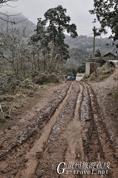 风雪中进村的土路满是泥泞,留下车子深深的辙印。