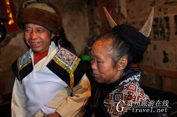 终于打扮停当了。女主人高高的发髻缠绕在尖尖的木角上。鲜艳的手工家绣披肩、外套,裙子黑白相间。男主人则全身着白色长袍,外罩彩色刺绣披肩。这些以白色红色为主调的服饰,晃眼夺目。