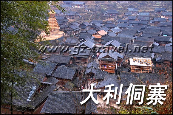 大利侗寨位于榕江县城东面,距县城23公里。全村共238户,1139人,皆为侗族。大利特产丰富,楠木丛生,主要景观有建于清乾隆58年的石板古道、五座侗族风雨桥、气派雄奇的侗族四合院以及独特的晾禾谷仓。村寨四周古木葱茏,古楠木树达400多株,体现了侗寨人与自然相和谐的“老人护村,古木佑寨”的传统观念。