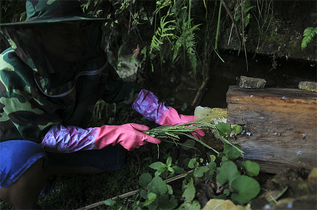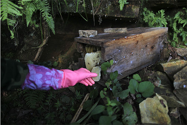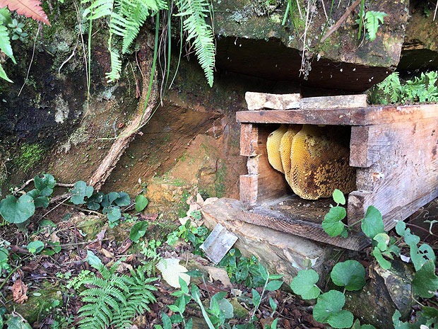 村民们说:保护区里的黑熊早就对蜂蜜恋恋不忘,村里每年的蜂蜜产量有近五分之一进了熊肚里。原本村民都把蜂箱放在深山里,被熊吃了以后得了教训,现在都转移阵地到熊够不着的地方,所以在石灰河村的路旁常会看到一些石壁里放着蜂箱。