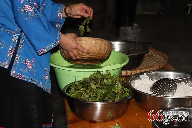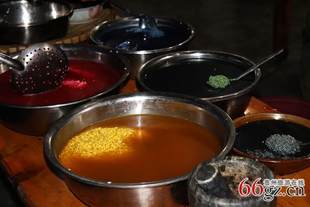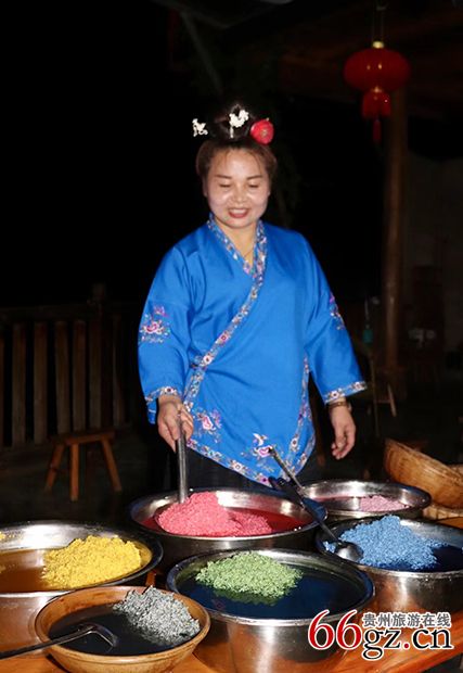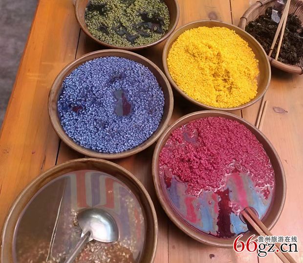 五彩姊妹饭是将糯米泡软,再将密蒙花、乌树叶等六种植物或煮,或泡水,提取出自然的颜色之后,把原料打捞出来,将糯米放入无添加的染色水中染色,最后放入木甑中蒸。打开用木蒸饭的木甑时,香味已经覆盖了大半个村子。